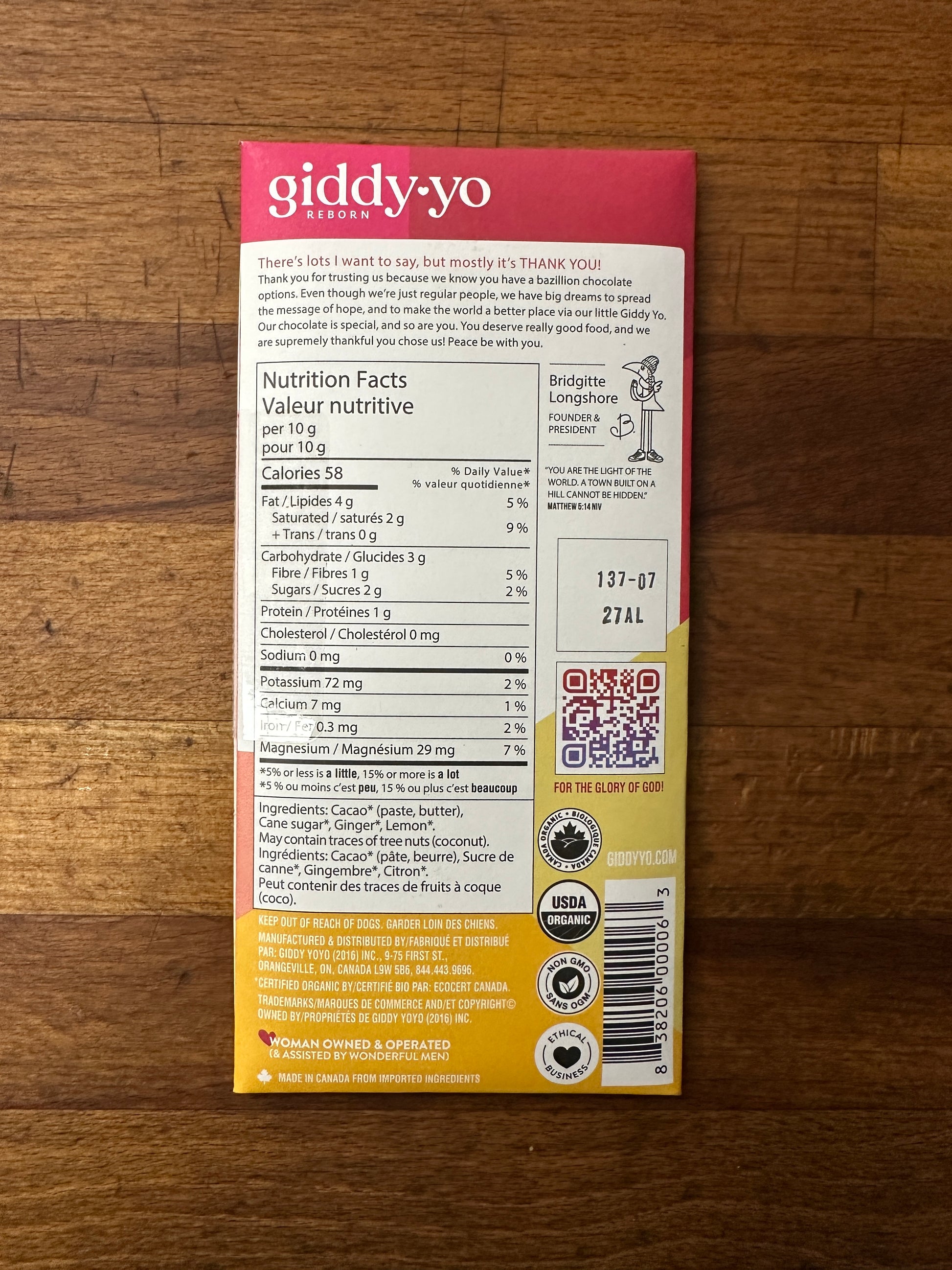 Ingredients: *Cacao (Paste, Butter), *Biodynamic Golden Cane Sugar, *Ginger, *Lemon essential oil. Ingrédients français: *cacao (pâte, beurre), *sucre de canne, *gingembre, *citron. *Certified organic/ certifé biologique by/par Ecocert Canada