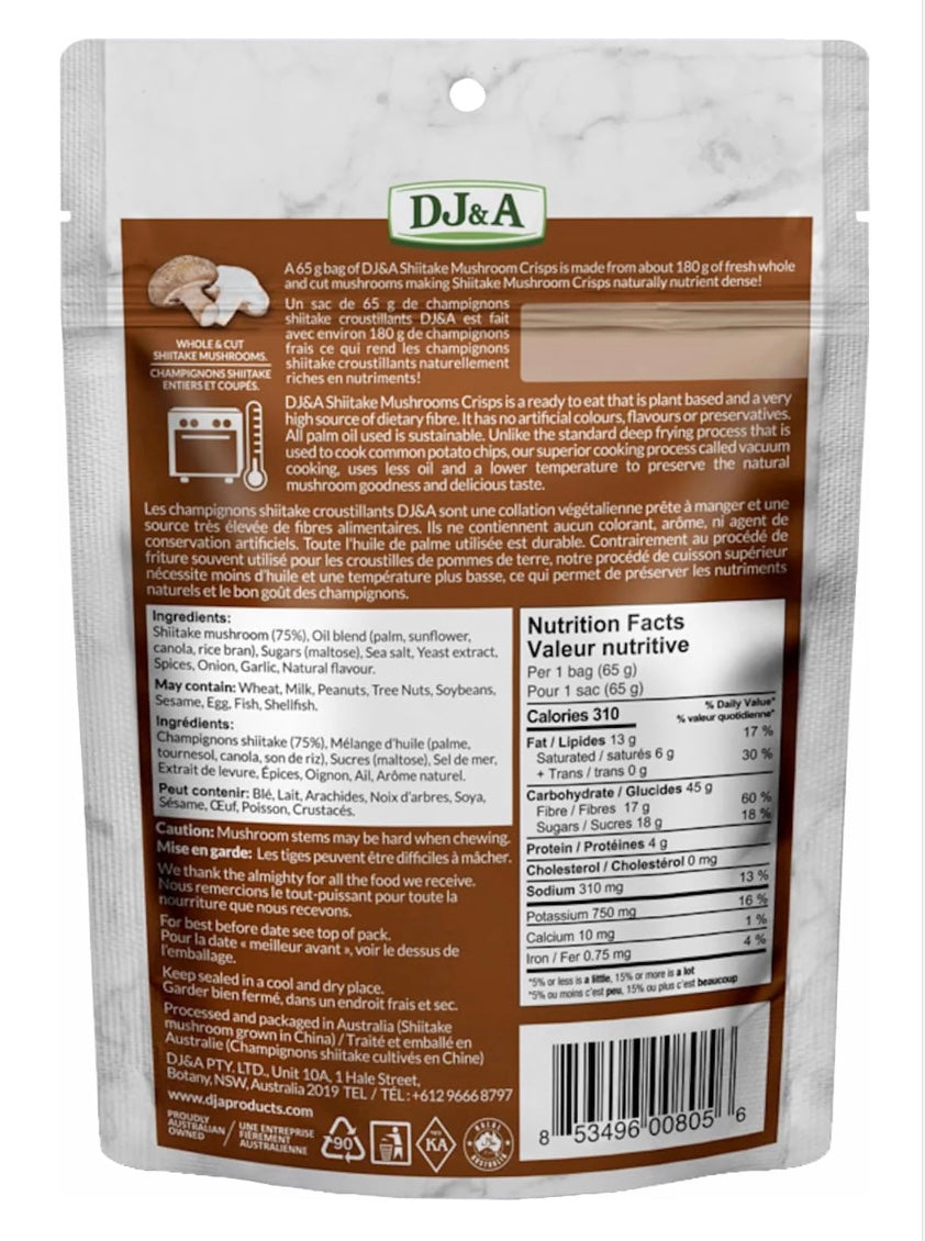 DJ&A Shiitake Mushrooms Crisps is all natural and plant based. It contains no added MSG, no genetically modified vegetables and no artificial colours, flavours or preservatives.